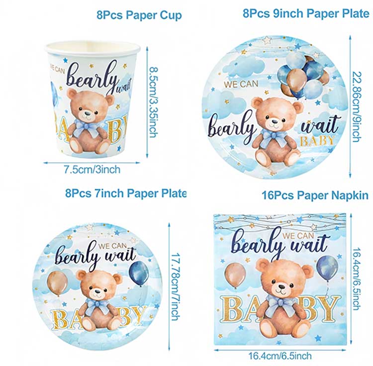 Engangs tallerkensett for babybursdag: Produktet er pakket i OPP-poser, men papirkortemballasje er også tilgjengelig. Vi kan tilpasse emballasjen etter kundens spesifikke krav.