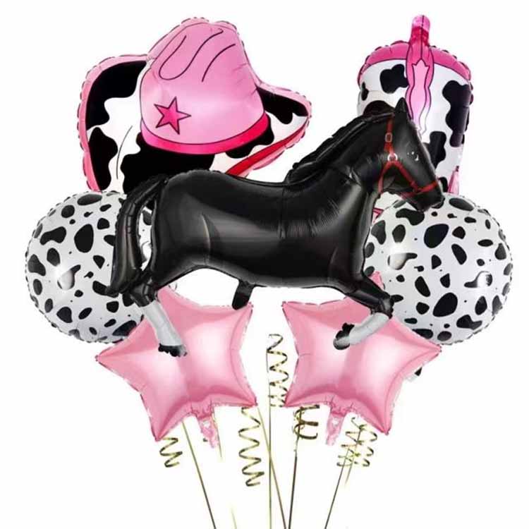 Med presise linjekonturer og fargetilpasning gjenoppretter de muskelkonturene og flytende maner til de løpende hestene, og vanlige naturlige fargevalg som brunt og svart samsvarer bedre med det virkelige bildet til hestene. Noen folieballonger med cowboytema legger til og med til metalliske farger som sølv og gull for å øke den visuelle effekten; kumønsteret er sirkulært, med svarte og hvite kumønstre trykt på det, og noen stiler legger til noen tredimensjonale dekorasjoner som små bjeller og plush haler under aluminiumsfolieballongene, som både er søte og har en landlig stil, og er et veldig populært tema for cowboyaktiviteter for familier.