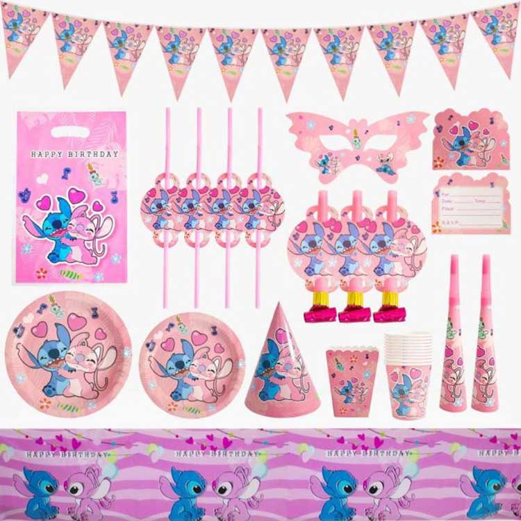7-tommers papirruller, 9-tommers papirruller, papirkopper, trekantede flagg, invitasjonskort, drageblåsere, høyttalere, sugerør, masker, papirhatter, popcornbokser, vev, duker, gaveposer, blå kniver, blå skjeer, blå.