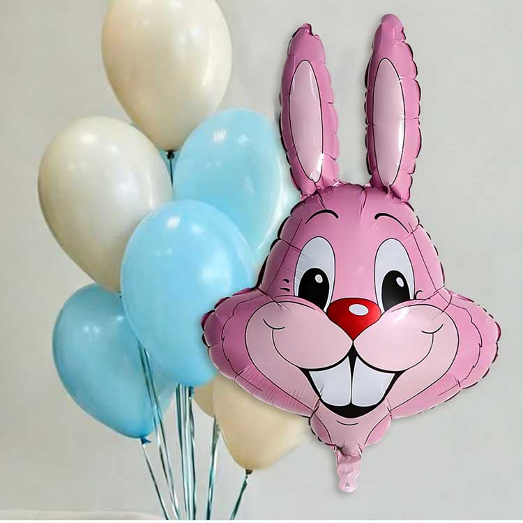 Denne påskekaninfolieballongen måler 53 cm x 83 cm når den ikke er oppblåst og 43 cm x 70 cm når den er oppblåst. Ballongene er laget av fortykket nylon, og har levende trykte design og er tilgjengelige i fire farger. Hver pakke inneholder 50 ballonger. Disse ballongene kan fylles med helium og flyte i luften.