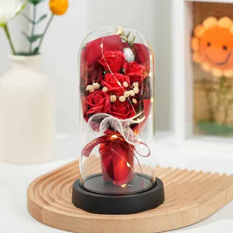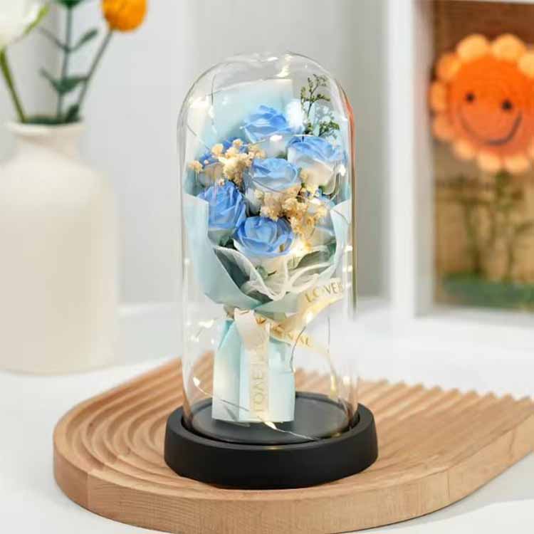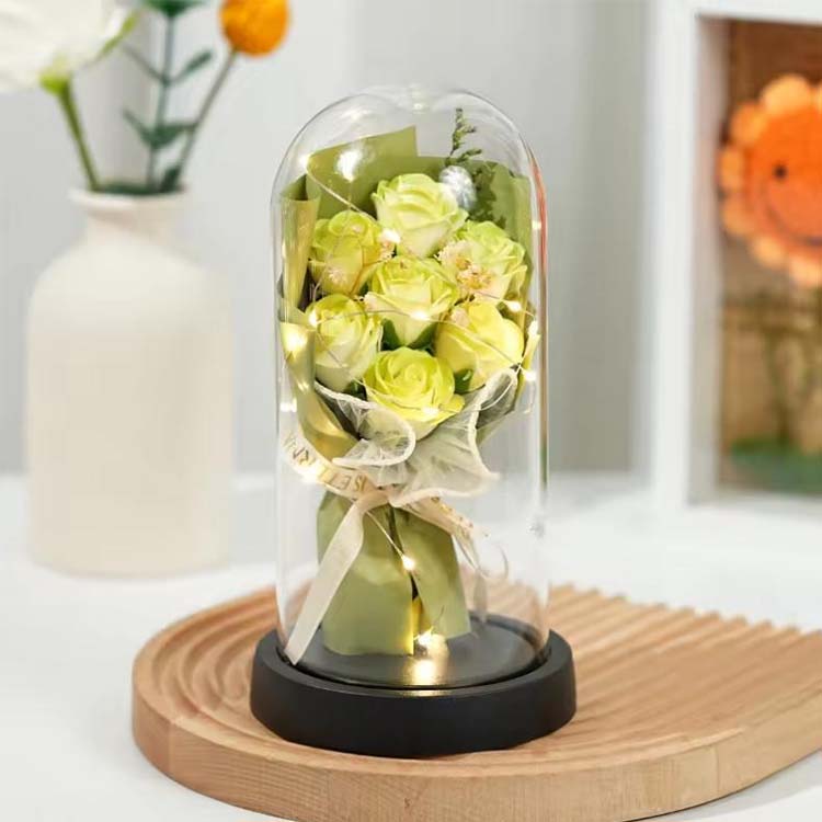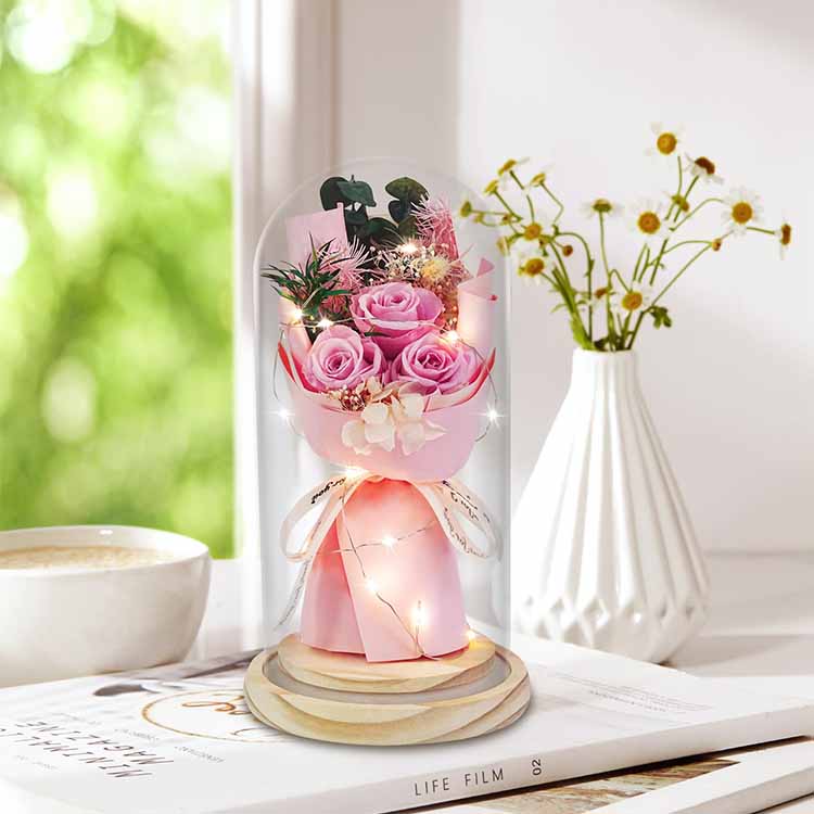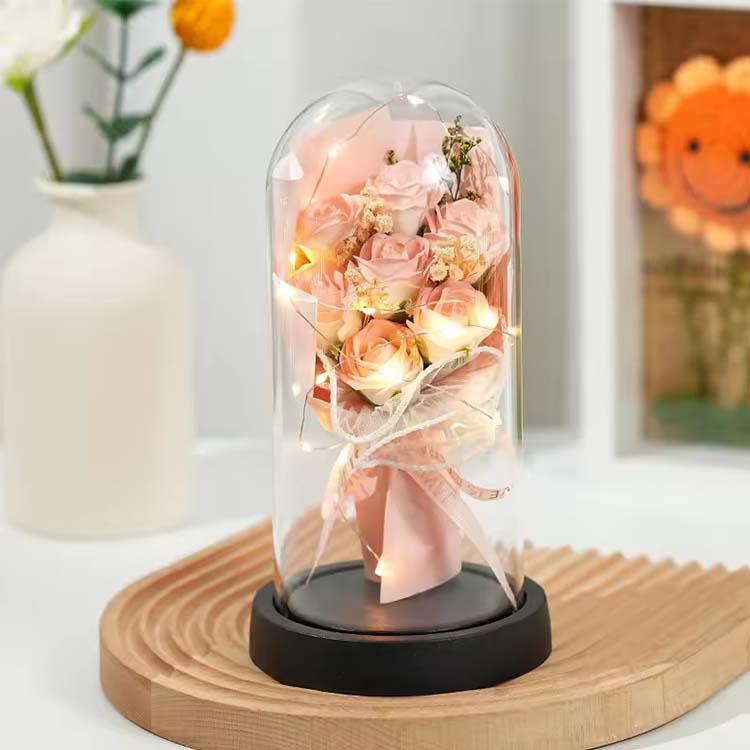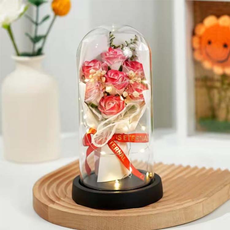 Såperosbuketten i glasskuppel med LED brukes i kombinasjon med såpeblomster og konserverte blomster.LED-lys bruker varmt og ikke-skinnende lys, som kan gi en varm atmosfære når du dekorerer scener. Den innebygde LED-lysstrengen har også fargerike blinkende lys, og fargene kan tilpasses for å møte dine behov.Denne buketten med glassomslag kan brukes til å sette, bursdagsscener, etc. og kan også gis som gave.Evige blomster vil ikke visne og vil ikke endre farge selv med et glassdeksel. Såpeblomster kan også brukes til å vaske hender eller som duft. Denne rosebuketten er økonomisk og praktisk.