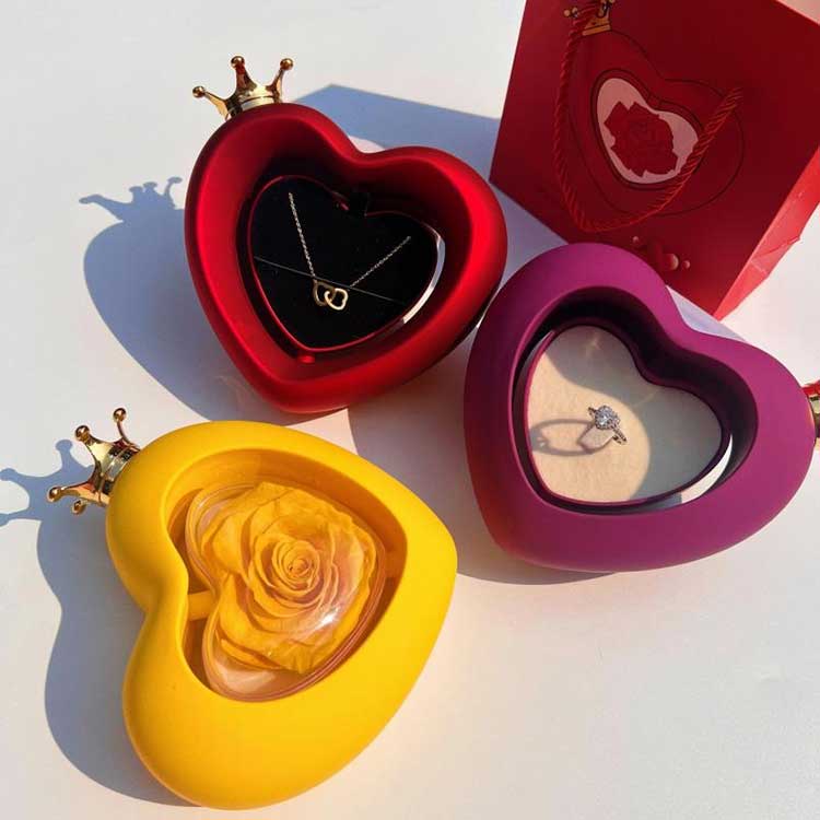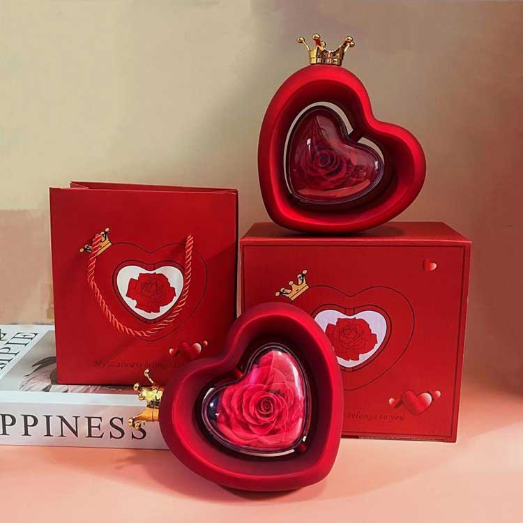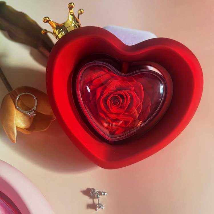 Heart Shape Rose smykkeskrin bruker klasse A konserverte blomster, hvis farge og tekstur ikke kan skilles fra friske blomster.