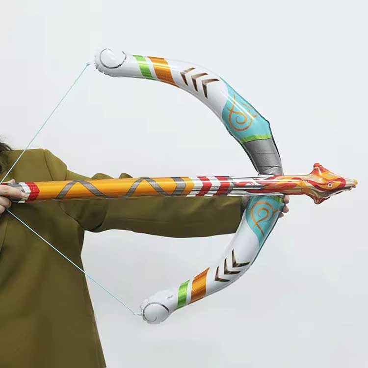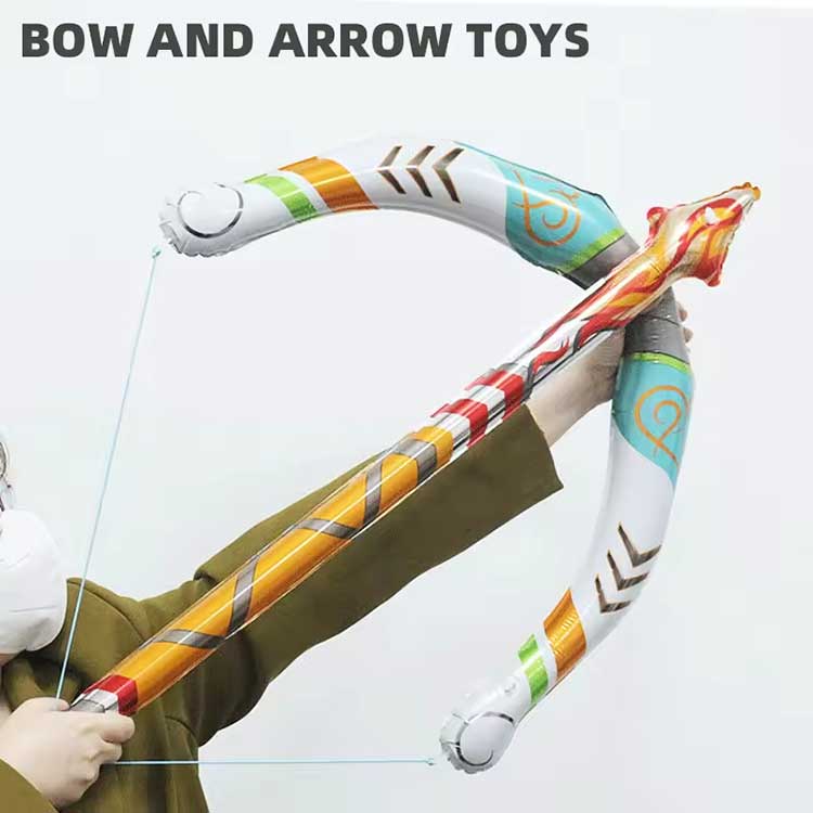 Oppblåsbart bue- og pillekesett er laget av PVC, i stand til å tåle barns entusiastiske lek. Den blåses raskt opp og beholder formen lenge. Inkluderer tre sverd for enklere utskiftbarhet.