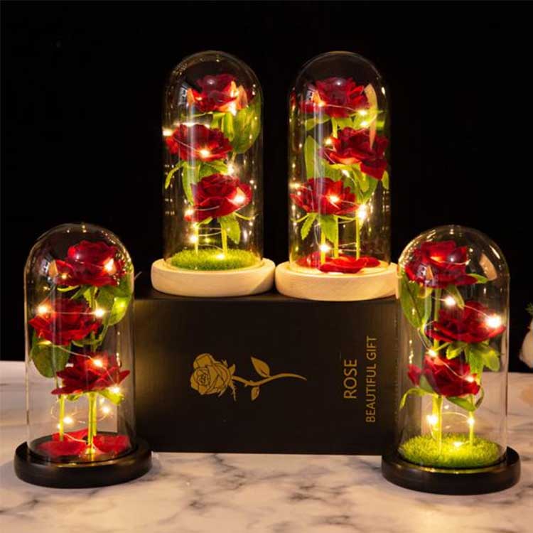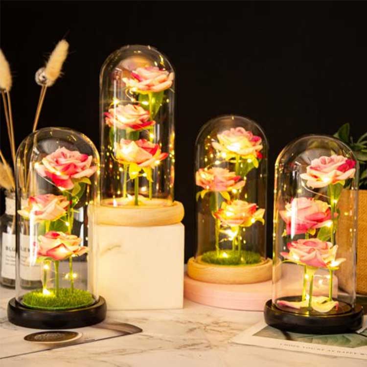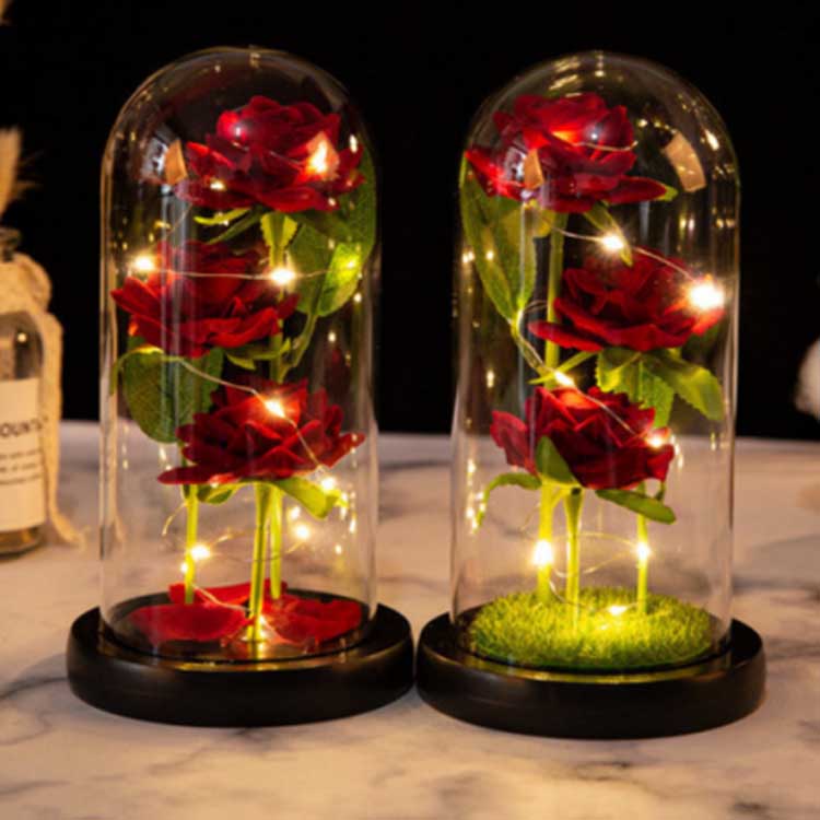 Inne i roseglasskuppelen er tre bevarte blomster plassert i forskjellige høyder, med realistiske stilker og grønne blader. Glassdekselet er varmebestandig og ikke lett å skade. LED-slyngelysene har innebygget dempet belysning, og bryteren er plassert under trefoten for enkel betjening. Egnet for bruk i bryllupsdekorasjoner og boliginnredninger, og kan også leveres som gave- eller bursdagsgave. kuppel og et tilpassbart gavekort.