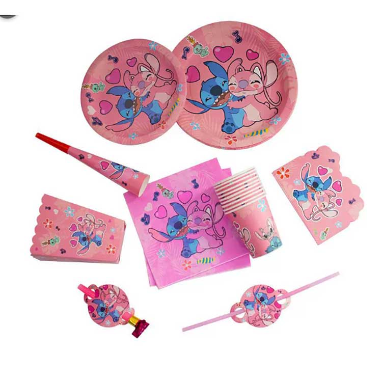 Et Stitch engangstallerkensett inkluderer følgende produkter: 7-tommers tallerkener (10 stk/pose), 9-tommers tallerkener (10 stk/pose), servietter (20 stk/pose), vimpler (10 stk/pose), returgaveposer (10 stk/pose), popcornbokser (6 stk/pose), blåsedrager (6 stk/poser), papir/poser (6 stk). (10stk/pose), horn (6stk/pose), sugerør (10stk/pose), invitasjonskort (10stk/pose), masker (10stk/pose), skjeer, bestikk (10stk/pose), og duk (1stk/pose). Settet inneholder 17 forskjellige produkttyper. Kunder kan velge å kjøpe hele settet eller velge bare en del av varene for å møte deres behov.