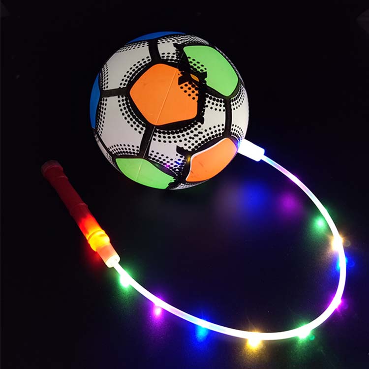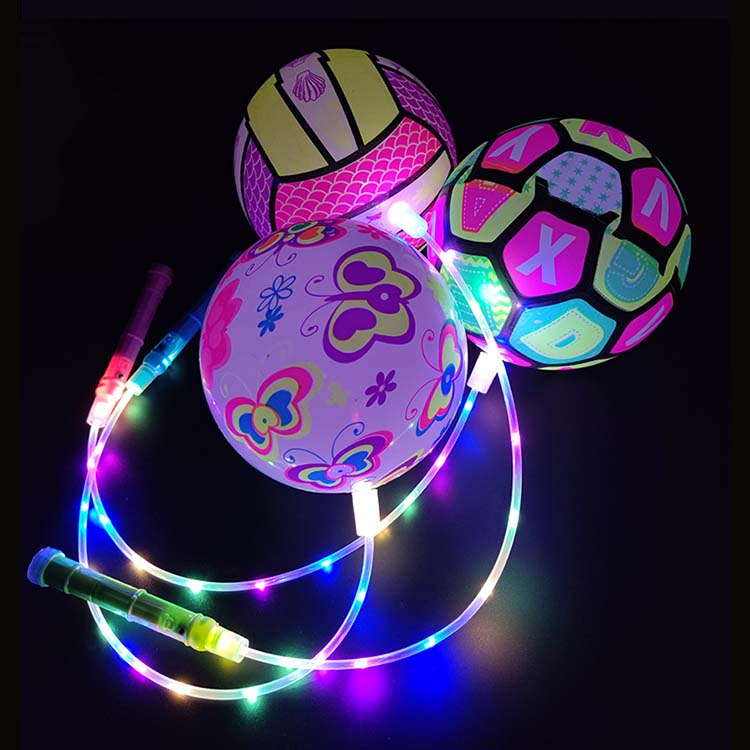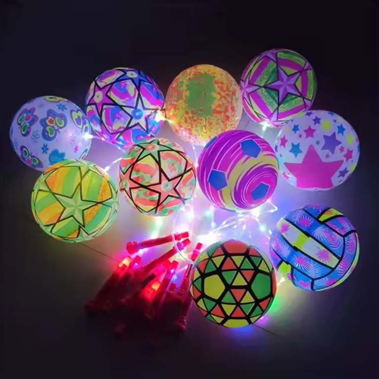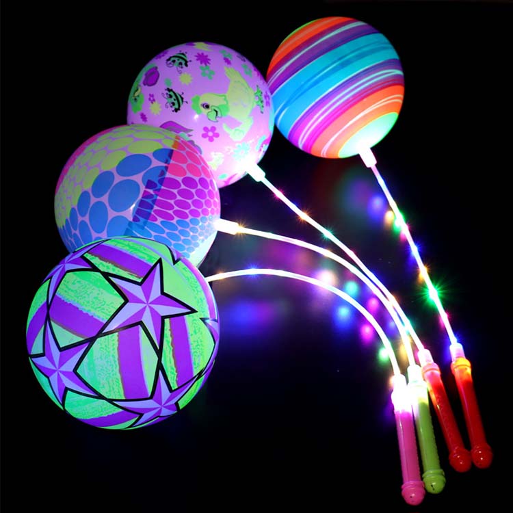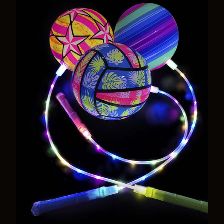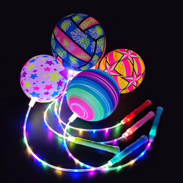 Streng hoppballer med LED -lys er hoppende ball bundet til streng, med LED -lys innebygd inne eller på overflaten. Når de er snudd på, avgir lysdiodene fargerike lys når du spretter, svinger eller holder det. Disse lysene er mer synlige i mørke miljøer.