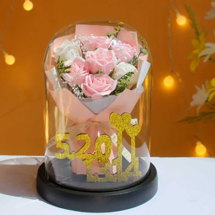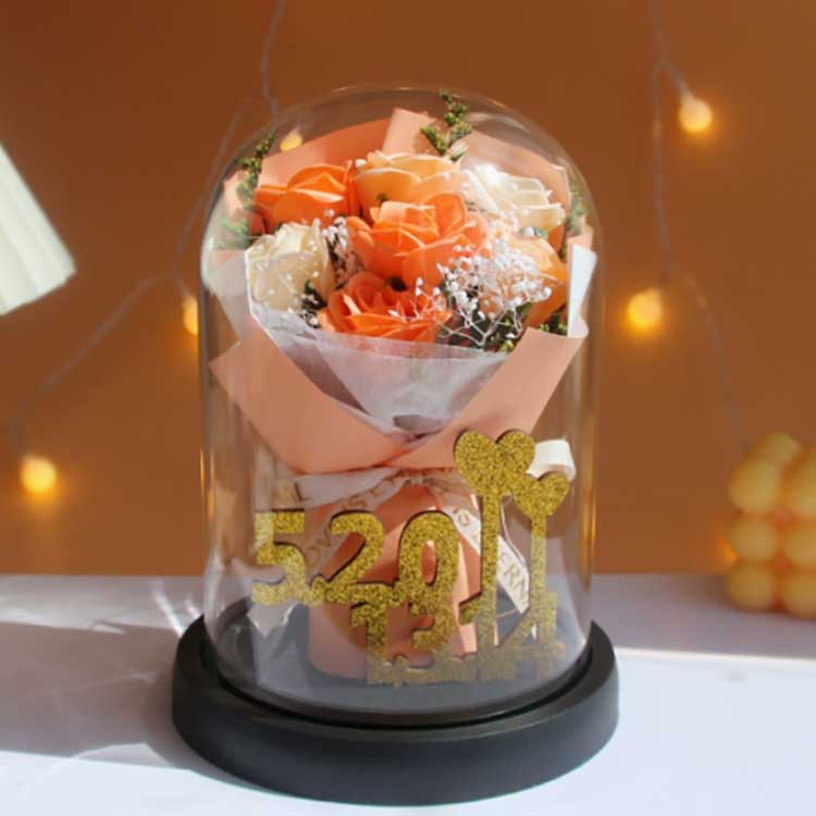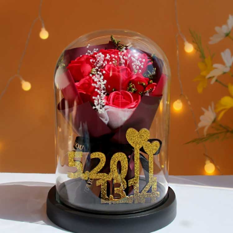 Denne glassrosebuketten er designet for å forhindre at blomster visner, og rosene inni vil ikke falme. Buketten er veldig naturtro, kan nesten skilles fra ekte blomster, og den kan presentere bukettens skjønnhet veldig godt. Innvendig representerer de gyldne tallene 520+1314 tallene 520 og 1314, som symboliserer kjærlighet og fremhever omtenksomheten til denne gaven.